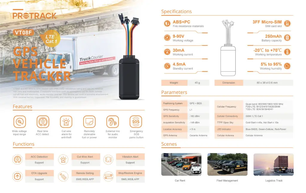 VT08F-PRO4G+ is a 4G+ vehicle GPS tracker with IP65 water resistance rating and can be installed into cars and motorcycles. It supports functions such as emergency call for SOS, remote cut-off fuel and electricity, audio monitor (Microphone) and etc. The device can work in extreme environment. With detailed factory inspection, the durability and stability is guaranteed.